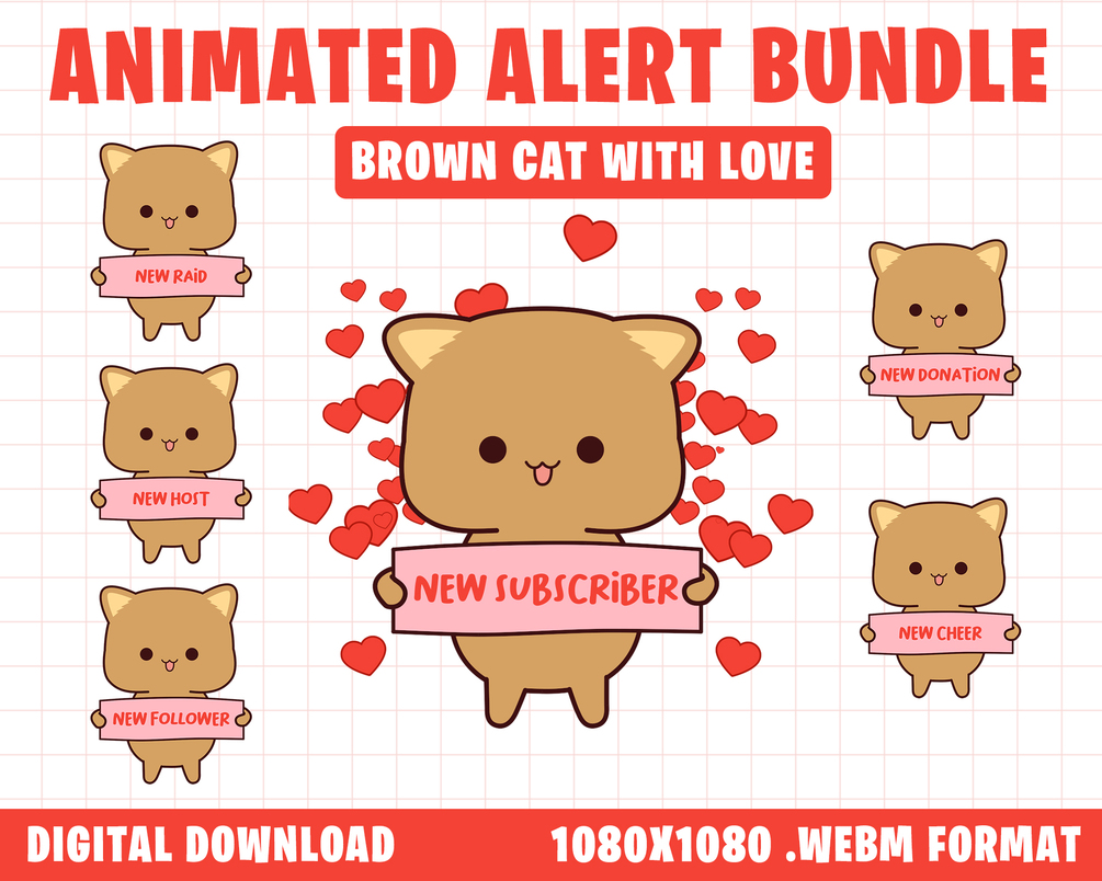 x6 Animated Twitch Alerts / Stream Graphics / Kawaii / Streamer / Pastel / Aesthetic / Simple / Brown Kitty With Love
